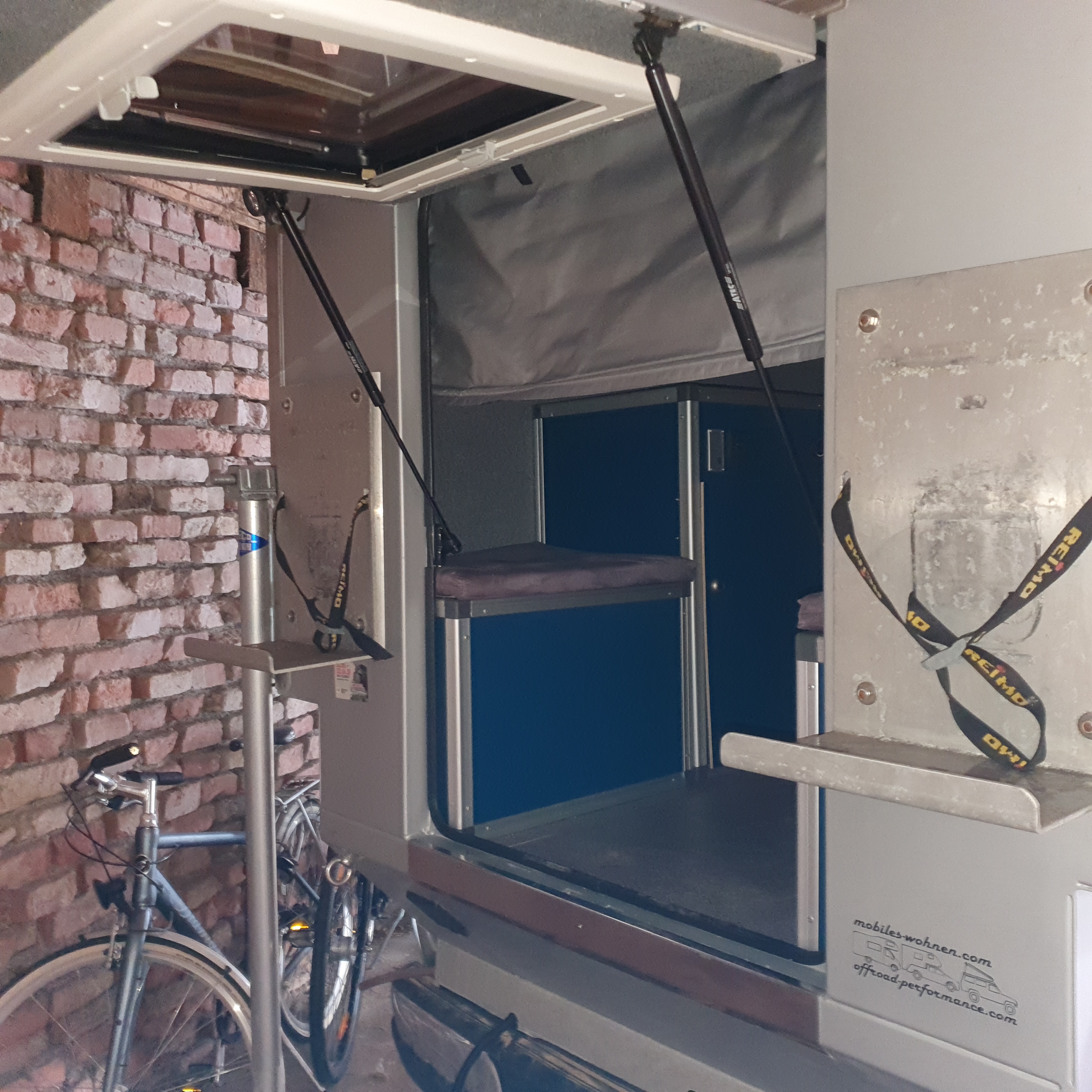 Aluminium Kabine, Webasto Diesel Standheizung mit eigenem Tank, Spirituskocher, Solarpanel Reimo CB-120, Porta Porti, Wetterschutz für Zeltbalg, Sandbleche