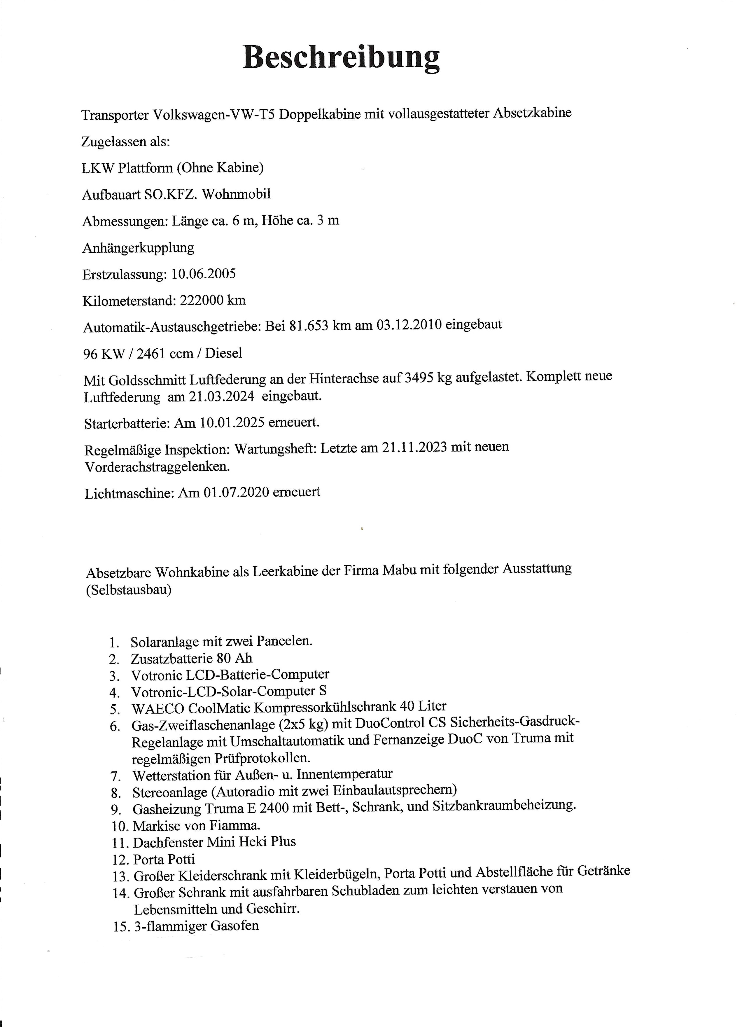 ich verkaufe aus familiären Gründen meinen geliebten VW-T5 Doppelkabine mit Absetzkabine.