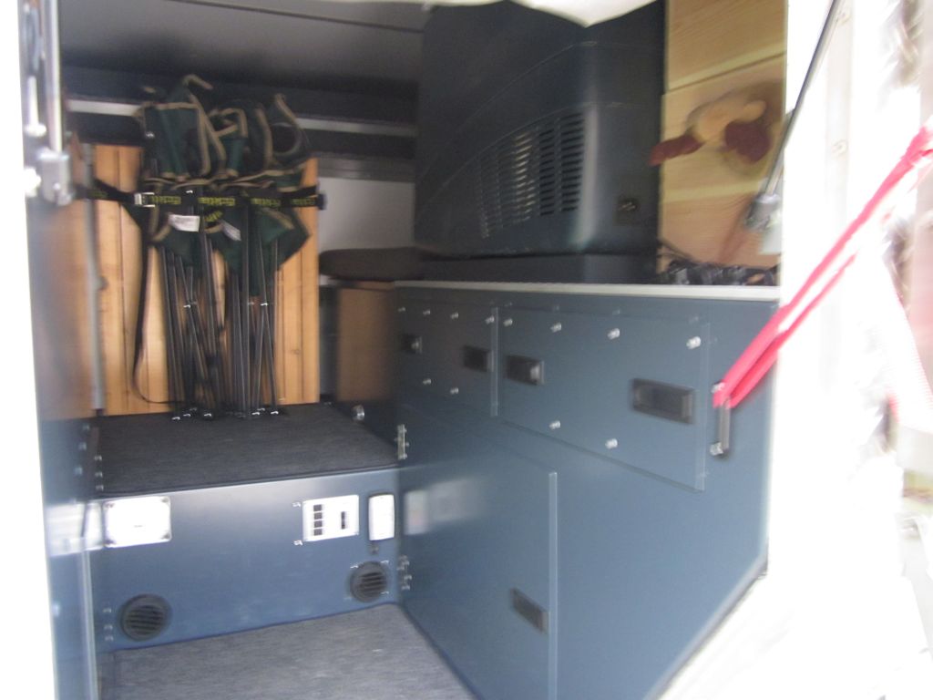 Neues Porta-Potti, innen im Stauschrank untergebracht. 2 Seitz-Fenster seitlich in der Kabine. Tisch innen ausklappbar. Kühlbox 12V mit Halteplatte.