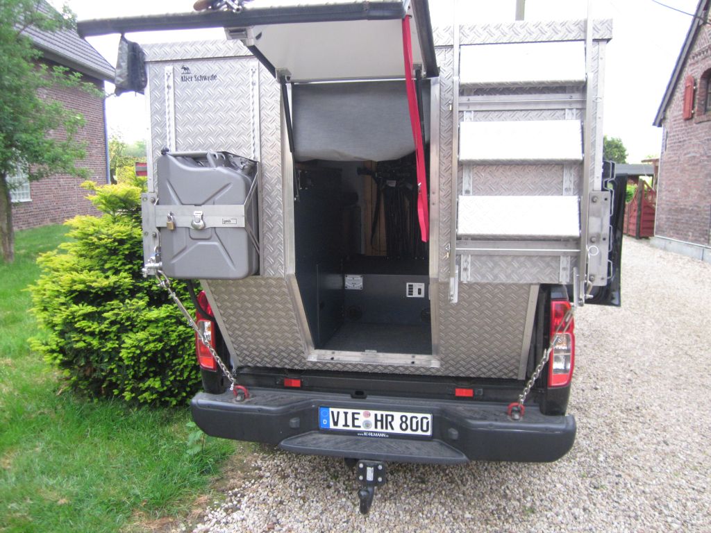 Solar auf dem Dach incl. neuer Batterie und Trennrelais. Außen auf Airlineschienen angebracht: 2 Sandbleche, Spaten, Einstiegleiter und FW-Kanister,